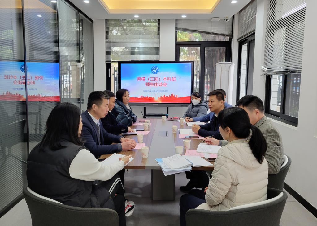 为深入学习宣传贯彻党的二十大精神,对标“深学争优、敢为争先、实干争效”行动,进一步加强师生之间的沟通交流,倾听学生心声、解决实际困难,2月22日上午,公共管理学院在左海校区学生服务中心召开劳模(工匠)本科班师生交流座谈会。学院党总支书记、院长张海主持会议,劳模(工匠)本科班学生代表、班主任及相关科室负责人参加座谈会。