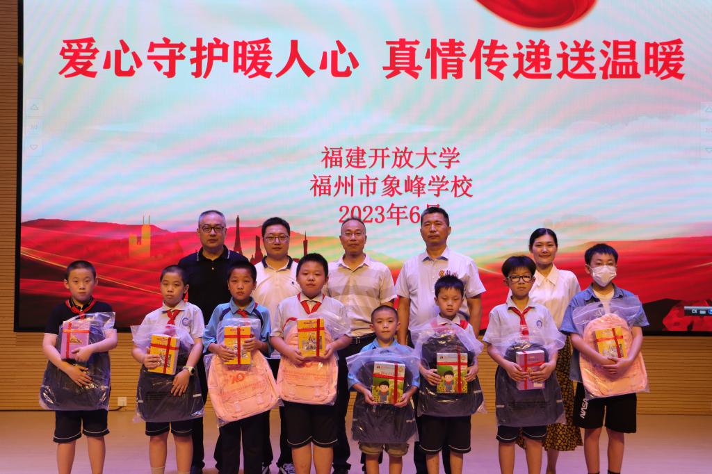 我校教职工代表首先为象峰学校家庭经济困难学生代表送上书包和书籍,将关心关爱传递到他们心中,并勉励他们:要牢记嘱托,珍惜时光好好学习,掌握知识本领,做祖国和人民事业发展的接班人。