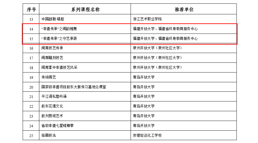 近日,教育部职业教育与成人教育司发布《关于公布社区教育“能者为师”实践创新项目第三批启动名单及特色课程推介名单的公告》,经各省级教育行政部门推荐、专家工作组审核与教育部指定网站公示等环节,全国共启动第三批实践创新项目479项,共254门系列特色课程被推介。我校申报的两门课程“非遗传承”之闽韵雅舞、“非遗传承”之守艺承袭被推介为“非遗传承”主题特色课程。被推介的课程将在中国社区教育网、日新学习网、“网上社区教育大讲堂”微信公众号进行展示。