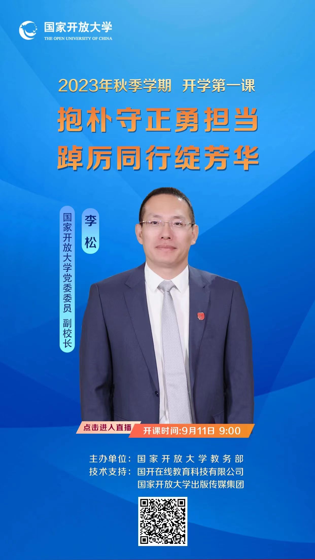9月11日上午,国家开放大学党委委员、副校长李松通过视频直播方式面向开放大学体系全体学子、教职员工及社会公众主讲题为《抱朴守正勇担当 踔厉同行绽芳华》的“开学第一课”,带领大家共同开启2023年秋季学期旅程。文经学院组织全院师生通过“人民网+”客户端、国家开放大学云教室、国开之声、国家开放大学 bilibili、国开在线直播课堂等网络平台在线收看了“开学第一课”。