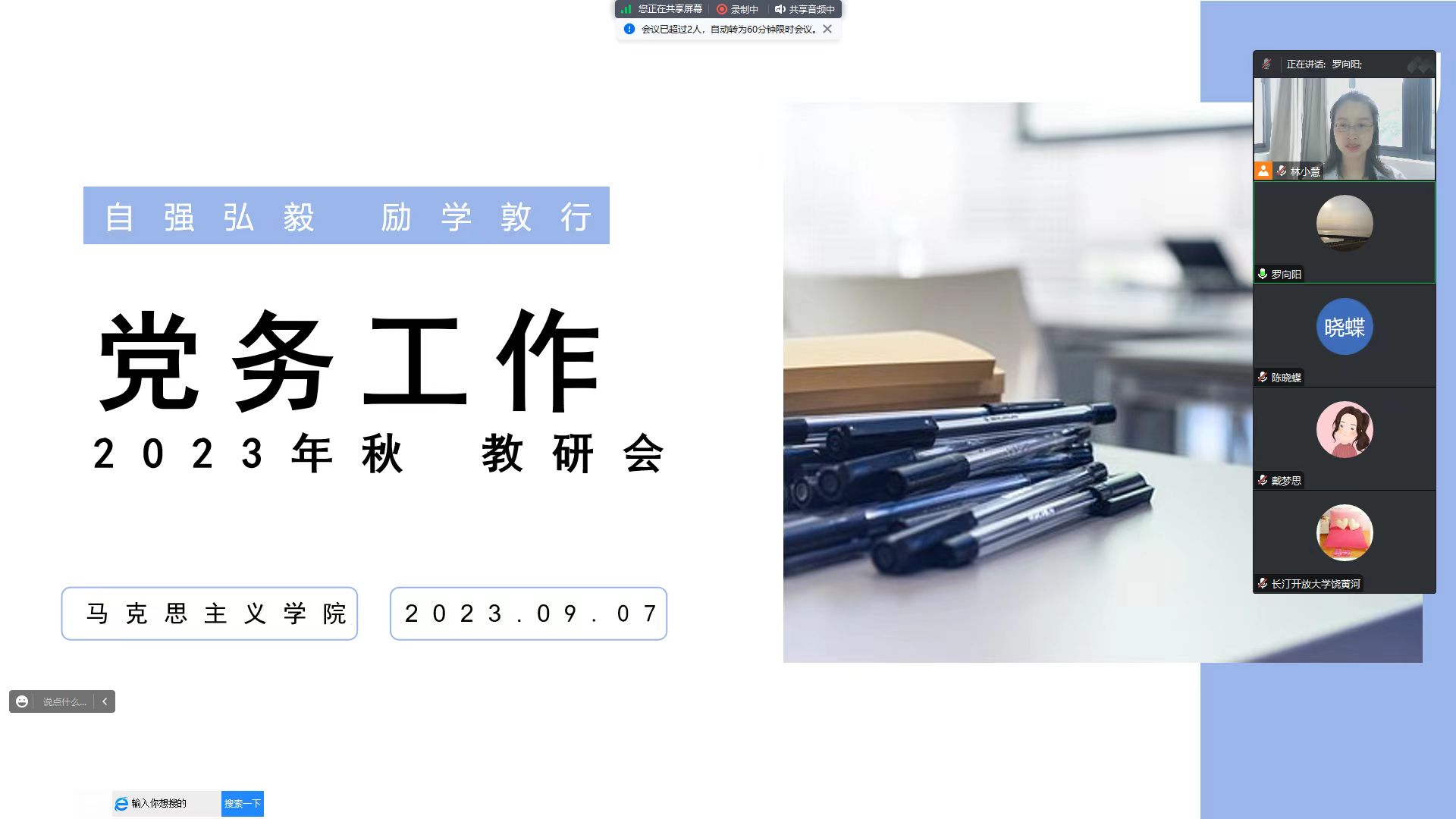9月7日上午,学院召开党务工作专业建设教研会。学院有关教师、全省办学体系有关党务工作专业班主任线上参加会议。会上,党务工作专业林小慧介绍了党务工作专业的基本情况,对专业开办以来的学生构成、课程设置、教学考试管理和学生活动等进行了总结,对新学期加强党务工作专业建设进行了部署。院长罗向阳强调,2023年春季是我省办学体系首次进行党务工作专业招生办学工作,学院从人才培养、教学管理等方面进行了有益尝试和探索,取得了积极成效。下一步,学院将从加强线上直播课程导学和专题讲座、开展教师线上集中教学研讨、提升学生学习支持服务能力、丰富学生活动等方面统筹发力,努力提升专业建设水平。会议还对班主任提出的共性问题进行了交流研讨。