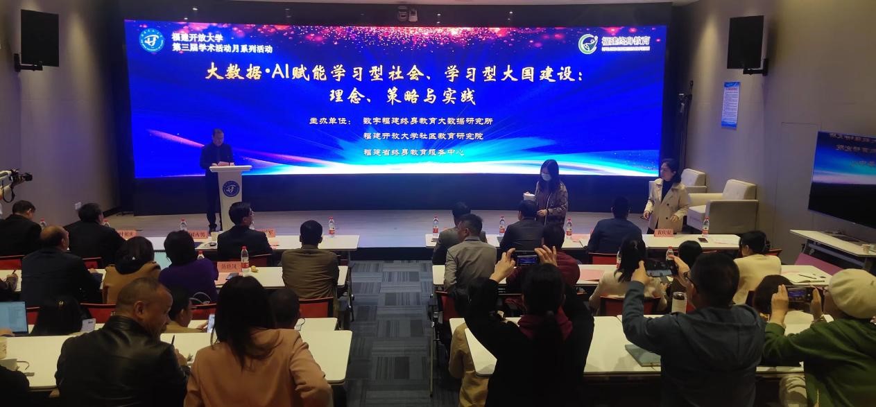 为持续推进学校学术氛围构建,12月13日,第三届学术活动月首场系列主题学术报告会《大数据·AI赋能学习型社会、学习型大国建设:理念、策略与实践》在左海校区智慧教室以线上线下融合的方式开展并面向全省终身教育服务体系成员开放。报告会由七大模块组成,主讲专家包括福建开放大学副校长沈光辉教授、华东师范大学博士生导师李家成教授、上海开放大学航空运输学院宋亦芳教授、教育部社区教育研究培训中心原常务副主任周延军教授、中央民族大学魏顺平教授、上海市教育科学研究院国卉男副研究员、浙江开放大学副校长张吉先研究员等业界知名学者,科研处处长黄庆安教授主持报告会。