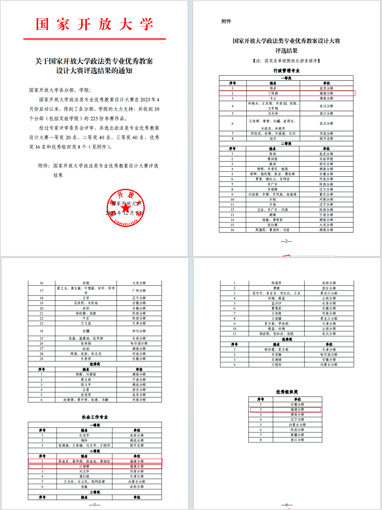 为深入贯彻落实党的二十大精神和习近平总书记关于教育的重要论述等精神,全面推动落实立德树人根本任务,鼓励体系教师及时将新理念、新技术、新案例纳入课程教学,不断提高教师深化教学改革的积极性、主动性,国家开放大学于2023年4月份启动“政法类专业优秀教案设计大赛”,39个分部(包括实验学院)、共计225份材料参加评选。经过专家评审委员会评审,评选出国家开放大学政法类专业优秀教案设计大赛一等奖20名、二等奖40名、三等奖60名、优秀奖16名和优秀组织奖8个。