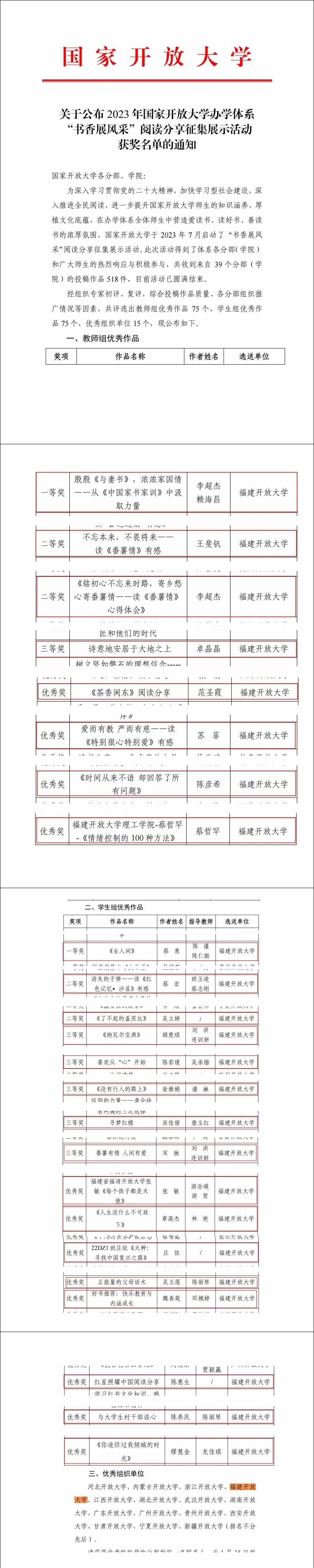 近日,国家开放大学公布了2023年国家开放大学办学体系“书香展风采”阅读分享征集展示活动评选结果。本次活动获奖视频共150个,其中由我校选送的作品共获得24个奖项(包括教师组作品8个,学生组作品16个),是国开办学体系中获奖最多的分部,成绩比较突出,我校荣获“优秀组织单位”。