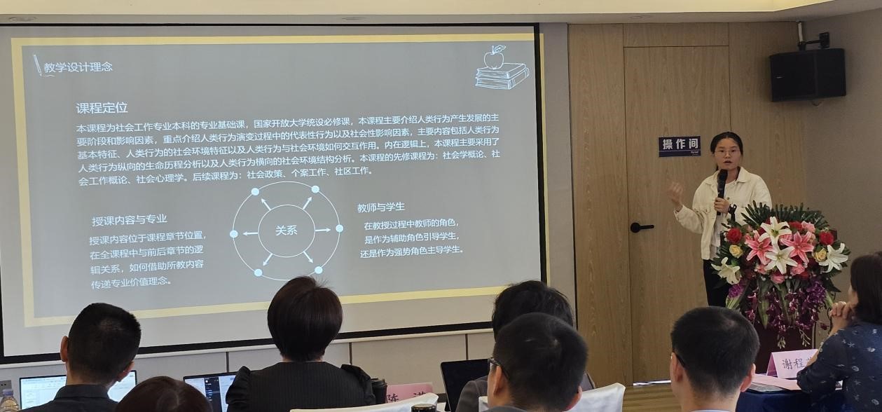 江丽娜老师则以“人类行为与社会环境”课程为例,从教学设计理念、教学过程以及教学设计思路方面分享了经验,并强调要从“学生为本、案例为引、专业为魂、学以致用”四方面做好课程教学设计反思。