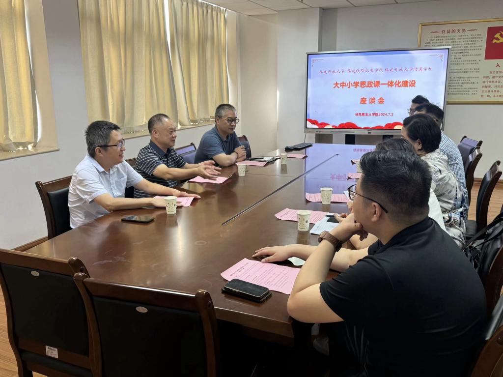 为深入学习贯彻习近平总书记对学校思政课建设作出的重要指示精神,进一步推进大中小学思政课一体化建设,7月2日下午,马克思主义学院与职业学院(福建铁路机电学校)、附属学校联合举行座谈会,就大中小学思政课一体化建设话题展开专题交流研讨。马克思主义学院、职业学院(福建铁路机电学校)、附属学校有关负责人和教师代表参加座谈,马克思主义学院院长罗向阳主持座谈会。