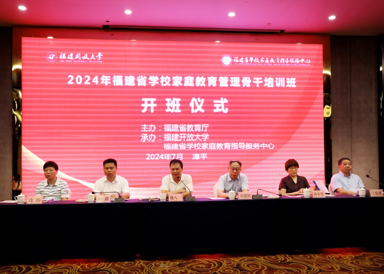 7月9日上午,由福建省教育厅主办,福建开放大学、福建省学校家庭教育指导服务中心承办的2024年福建省学校家庭教育管理骨干培训班在漳平市召开。福建开放大学副校长、福建省学校家庭教育指导服务中心主任吴建铭,福建省教育厅思想政治工作处二级调研员戴八一,漳平市政府副市长聂鑫,中国儿童中心原党委书记、儿童教育与家庭教育专家丛中笑,福建师范大学二级教授连榕出席开班仪式,福建开放大学培训学院院长、福建省学校家庭教育指导中心副主任江克英主持开班仪式。来自全省各地教育局思政科(股)、德育处,家庭教育指导中心的100名负责人参加培训。