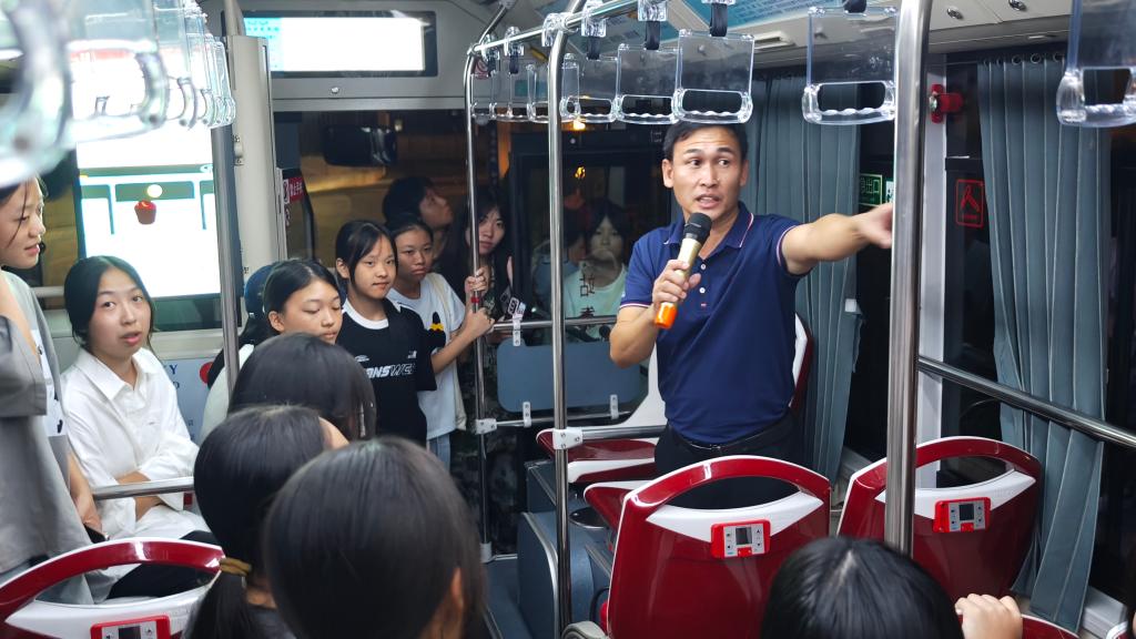 在“校友说课——劳模校友教你乘车”环节,全国劳动模范、全国“最美公交司机”、福州市公交集团职员、我校校友胡明华老师将思政课堂搬进大巴车。他围绕“公共交通安全与社会公德”主题,结合自身技能学习与“跨界”从业经历,为同学们带来一堂生动活泼的现场教学课。同学们沉浸在胡老师的讲授中,既学习了公共交通安全知识,也进一步理解了社会公德与个人品德的深刻内涵。他们表示,劳模工匠就在身边神奇又振奋人心,要向以胡老师为代表的劳模工匠们学习,将劳模精神内化为踏实求学、积极奋进的无限动力。