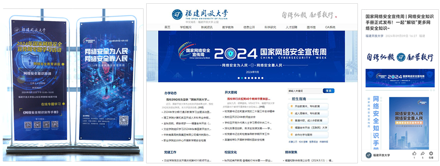 学校充分利用国家网络安全宣传周官方网站等线上资源,丰富校内宣传内容。通过在师生必经区域摆放宣传海报来提升师生对网络安全的关注度,并在学校官网上设置了网络安全宣传周宣传横幅和网络安全宣传周专栏,普及网络安全知识。此外学校还在官方微信公众号推送网络安全知识手册,引导师生重视并采取措施保护个人信息。
