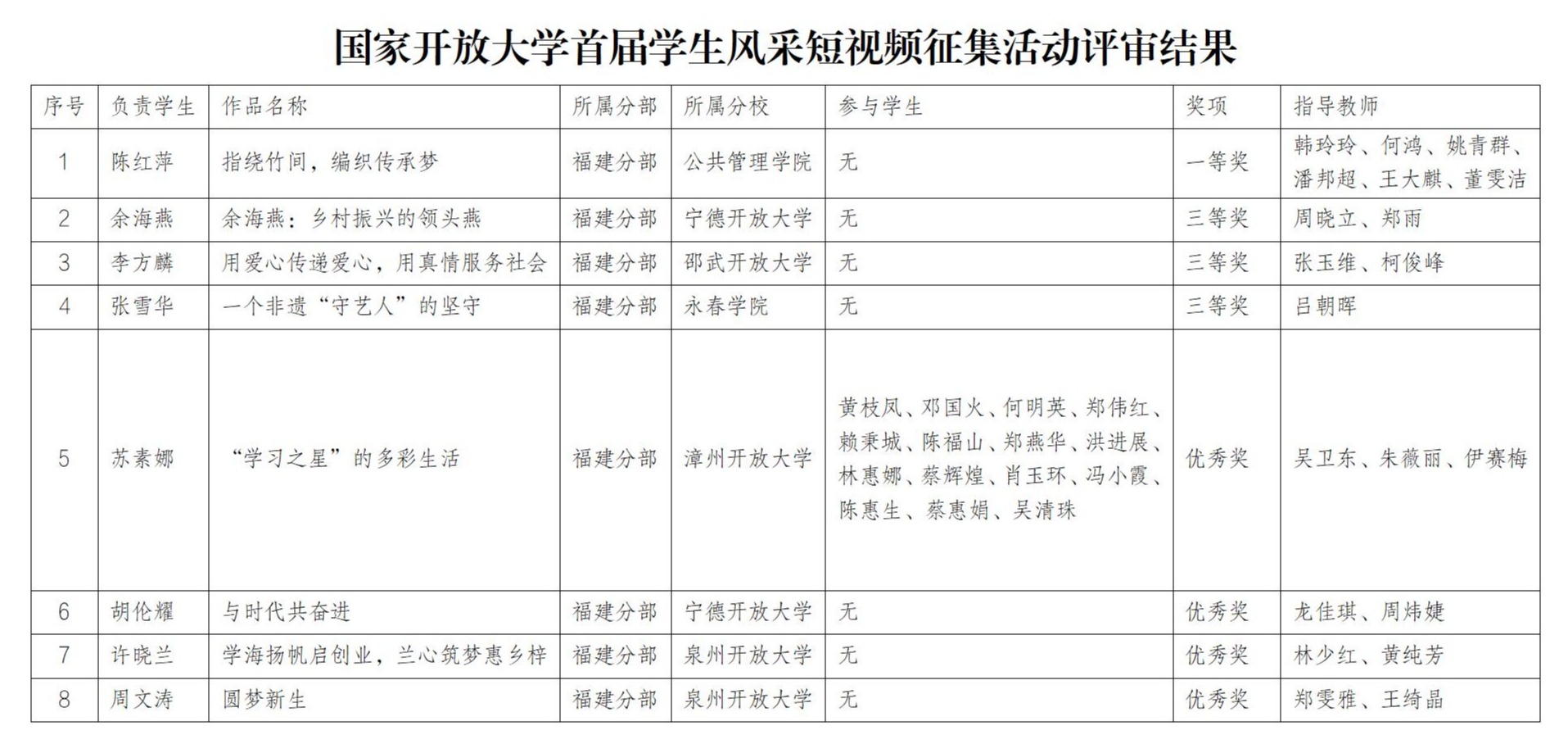 其中,我校公共管理学院作品《指绕竹间,编织传承梦》获一等奖,宁德开放大学作品《余海燕:乡村振兴的领头燕》、邵武开放大学作品《用爱心传递爱心,用真情服务社会》、福建开放大学永春学院作品《一个非遗“守艺人”的坚守》获三等奖,多项作品获优秀奖。