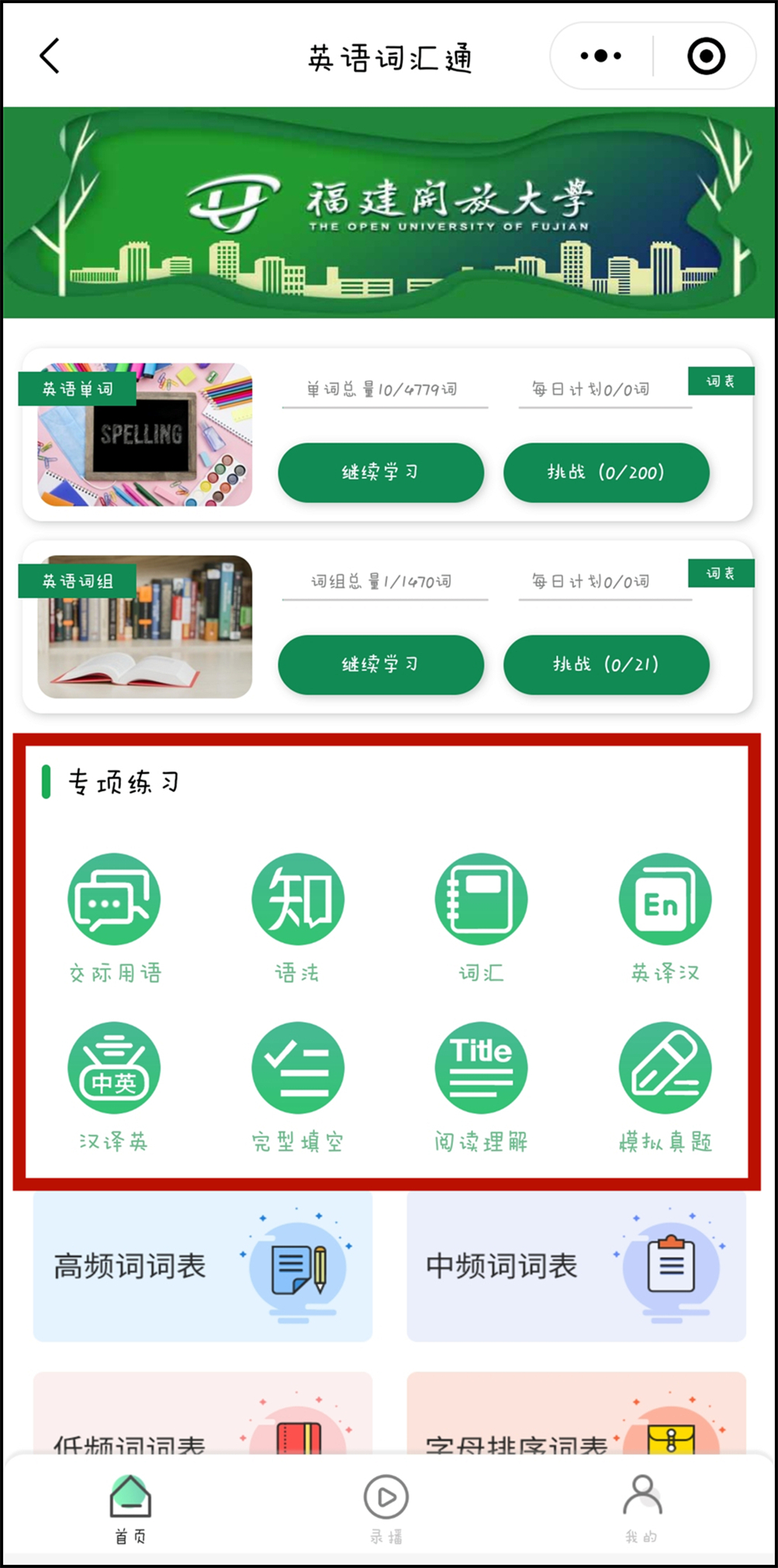 升级改版后的“英语词汇通2.0版”在原有单词词组精学、词汇分频进阶智学、词汇闯关游戏趣学、生词错词固学四个功能模块的基础上,结合学位英语考试题型及核心知识考点,增设“模拟练习题库”“直播课程资源库”“学习智管工具”,进一步提升学生智慧E学体验,助力学位英语备考。