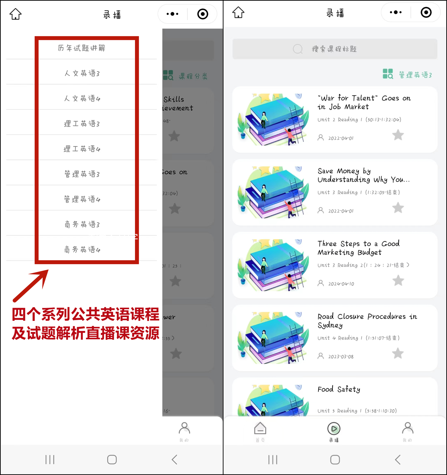 直播课程资源库:课程资源库基于学位英语考察知识面广,涉及公共英语(人文、管理、理工、商务)四个本科系列课程的内容范围,收录了四个系列公共英语阅读讲解、历年考试试题解析等优质的直播课资源,便于学生一键开启公共英语通学,全方位筑牢英语基础。
