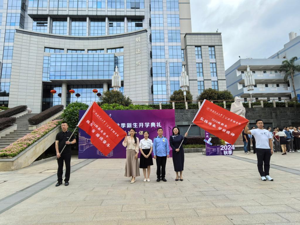 在明德楼广场前,学院举办了“薪火传承”授旗仪式。全国劳动模范、2022年秋季劳模(工匠)行政管理本科班学员胡明华将象征学院劳模精神的旗帜传递给新生代表,2023年春季社会工作本科班班长谢碧珍将象征学院学生骨干优良传统的旗帜传递给新生学生骨干代表。同学们以自信昂扬的姿态,坚定接过旗帜,骄傲挥旗致意。旗帜的交接象征着光荣和使命的传承,学院劳模精神和学生骨干优良传统悄然在新一届学生心中落地生根、开枝散叶。