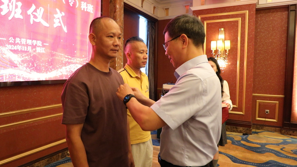 开班仪式上,李正光为新生代表佩戴校徽、赠送书籍。2024年秋季行政管理本科班学员谌根深作为新生代表发言,结合自身经历表达对进一步深造的渴望,号召同学们要以劳模精神严格要求自己,珍惜学习机会,在学校领导和老师的关心指导下,不断提升自我,在各自岗位做出更大贡献,行政管理(本科)专业主任王凌宇为新生作专业介绍。