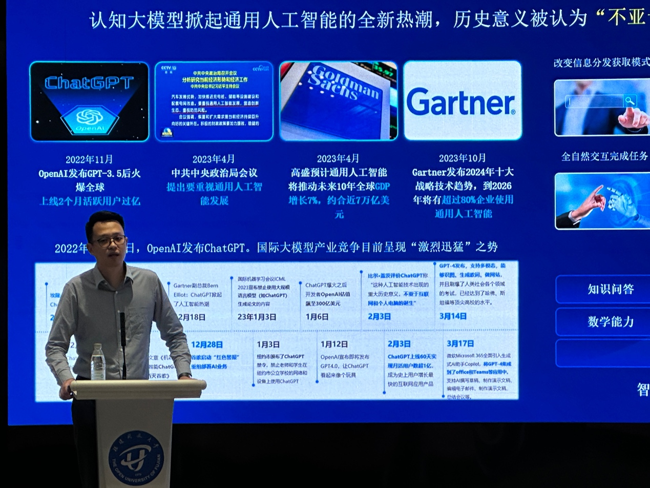 11月7日下午,“通用人工智能助力高校教育数字化转型”讲座在左海校区智慧教室开讲,作为“数字赋能远程开放教育”主题学术月系列讲座之一,学校邀请了科大讯飞教育事业群华南咨询总监、资深人工智能与教育信息化专家黄志原,为全体专兼职教师普及人工智能技术应用于教育教学的最新进展,以及AI如何深度赋能高校教学数字化转型。