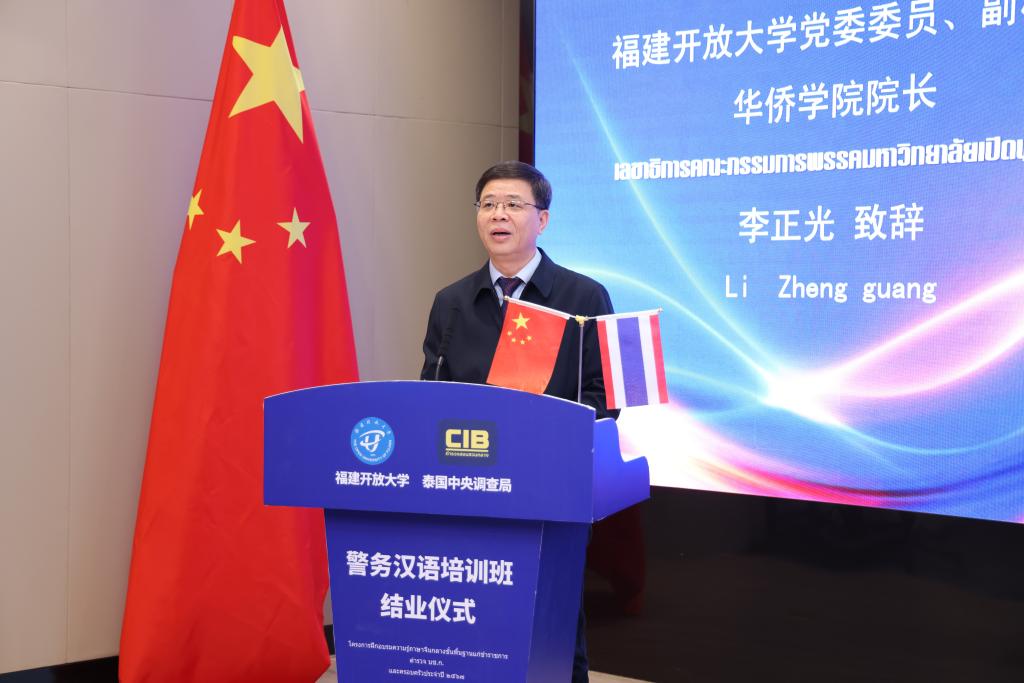 “这是华侨学院举办的第二届警务汉语培训班,行而不辍,未来可期。学院将进一步聚合教育资源,面向“一带一路”沿线国家开展中华文化教育培训”。李正光在致辞中希望学员们持续保持对汉语的学习热情与动力,将汉语知识融会贯通,运用所学所获推动警务工作更好地开展,努力做中泰友谊与合作的友好使者。