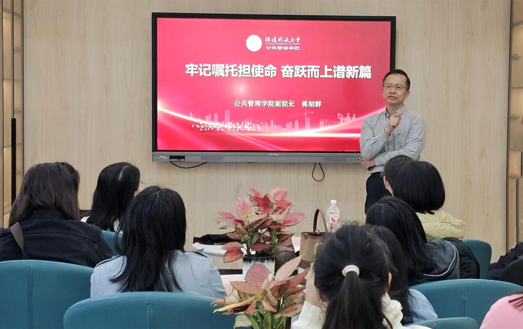 学院副院长蒋绍群以《牢记嘱托担使命 奋跃而上谱新篇》为题,为参训学员讲授思想政治理论课。他指出,习近平总书记在福建考察时的重要讲话为全省上下奋力谱写中国式现代化福建篇章指明了前进方向、提供了根本遵循。广大青年学生要牢记嘱托、感恩奋进,争做有理想、敢担当、能吃苦、肯奋斗,堪当民族复兴重任的时代新人。