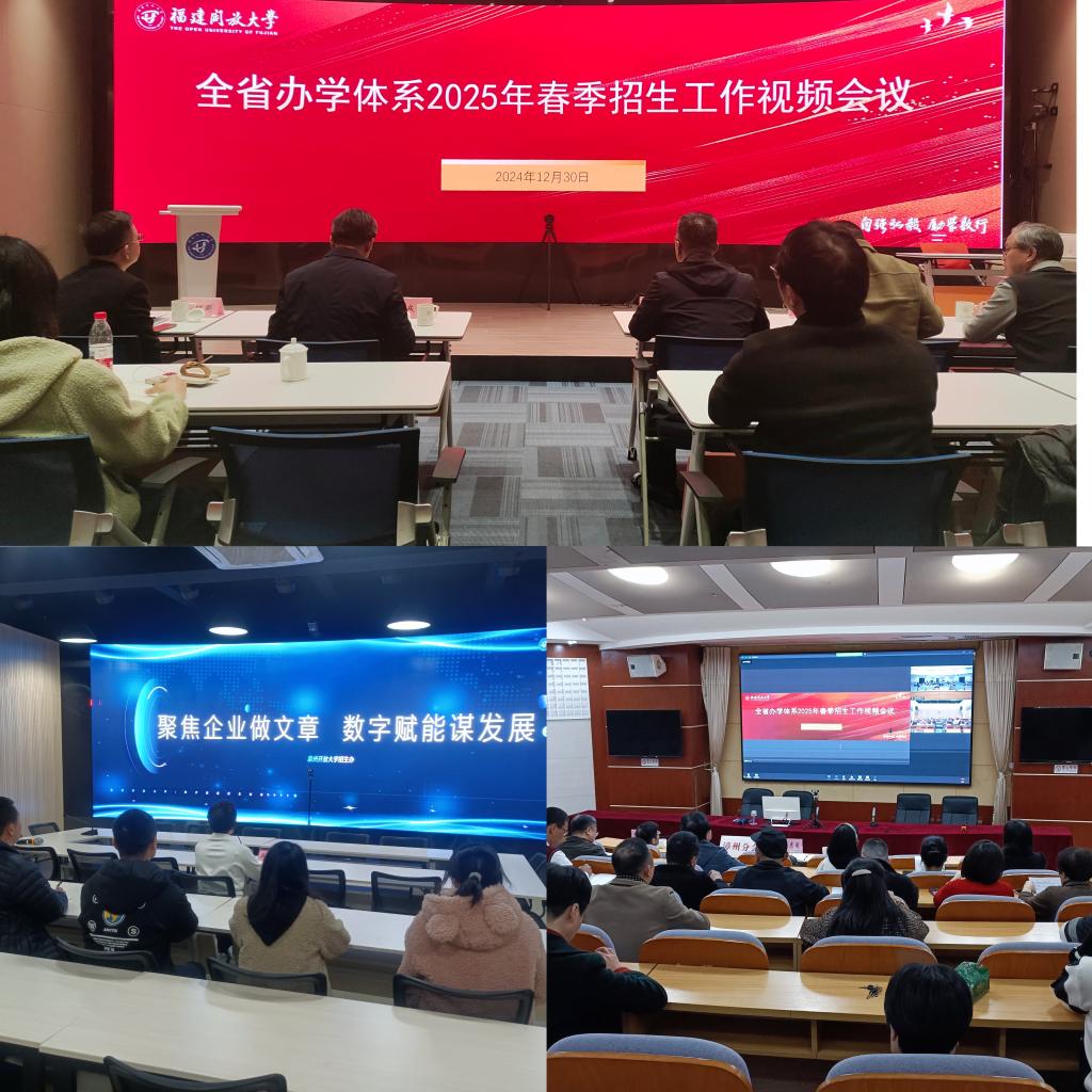 会议总结了2024年秋季招生工作,部署了2025年春季招生工作。泉州开放大学、南平开放大学和宁德开放大学招生办负责人作经验分享。招生与体系建设办公室和相关学院招生工作人员现场参会,各市县开大分管招生工作负责人及工作人员线上参会。
