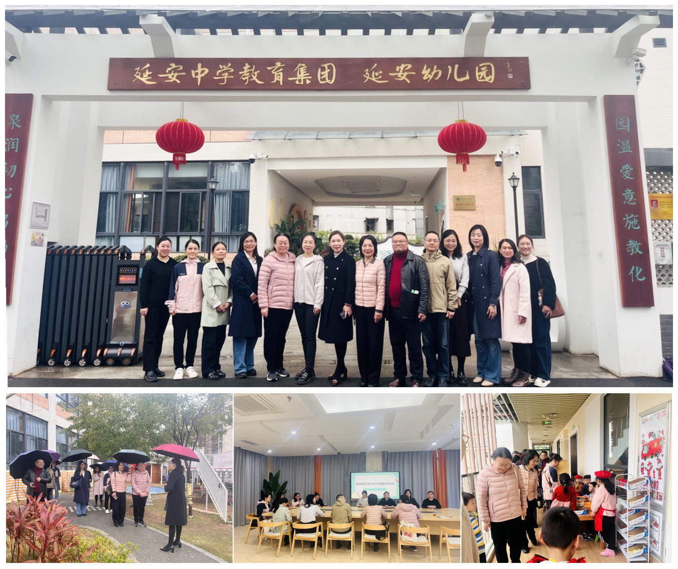 座谈会上,延安幼儿园园长介绍了园所的办园文化及生活化课程体系建设。双方就课程建设与人才培养展开交流,共同探讨如何构建更完善的学前教育人才培养体系,为社会输送优秀的学前教育师资,助力幼儿全面健康发展。公共管理学院教师围绕人工智能与幼儿园教育的融合、家校社协同育人、托幼衔接等方面提出思考。幼儿园分享相关案例与实践经验,为学院师生带来诸多启发。会后,大家共同参观了幼儿园整体环境和班级区域活动,并合影留念。