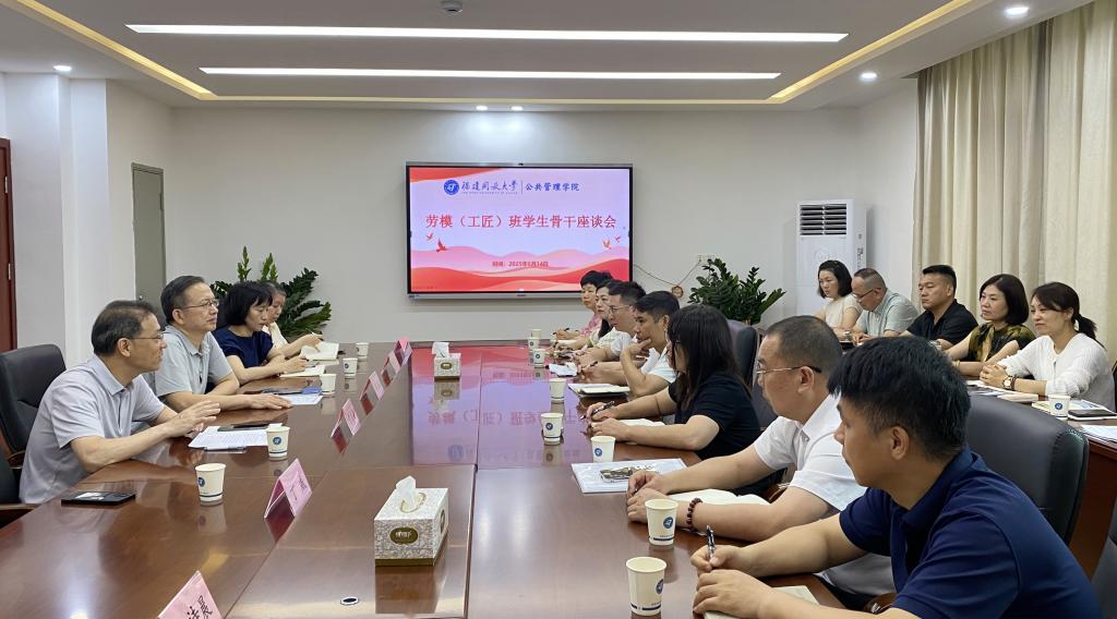 为深入贯彻中央八项规定精神,扎实开展调查研究,切实了解劳模(工匠)专班学员学习需求,6月14日上午,公共管理学院组织召开劳模(工匠)专班学生骨干座谈会。院长黄庆安、相关科室负责人及20余名劳模学生骨干代表参加座谈。会议由学院副院长蒋绍群主持。