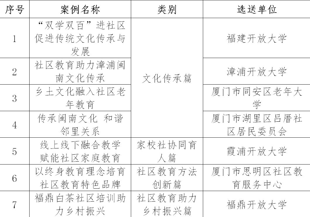 近日,在教育部职业教育与成人教育司指导下,由中国成人教育协会、中国教育科学研究院、国家开放大学及上海开放大学联合策划组织,高等教育出版社出版的《学习型社会建设案例系列——社区教育案例百选》正式发行,全书收录社区教育典型案例100个,我省共有7个典型案例收录其中,入选数量位居全国第三位。