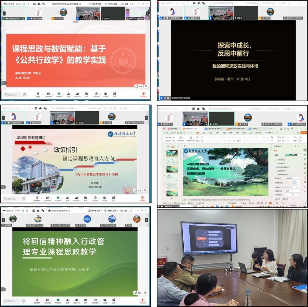 本次研讨会紧扣两大核心主题:一是深学细悟习近平总书记在福建工作期间到校调研和给学校建校20周年贺信指示精神,深入挖掘思政元素融入课程教学;二是深入挖掘课程中的集体主义精神和温暖元素,丰富思政融入实践载体。会上,多位教师进行了分享:泉州开放大学甘彩云以《课程思政与数智赋能:基于〈公共行政学〉的教学实践》为题,探索数字化技术与专业课程的思政融合路径;福建开放大学郭淑贞在《探索中成长,反思中前行——我的课程思政实践与体悟》中,结合一线教学经历,分享育人心得;福建开放大学华黄碧珠的《政策指引 锚定课程思政育人方向》,紧扣教育部课程思政建设纲要具体要求,明确育人目标定位;泉州开放大学黄春美的《AI赋能课程思政教学 客观自省,悦纳自我——教师自我认知偏差及改善》将人工智能技术融入教师素养提升,强化育人主体能力;福建开放大学王凌宇的《将回信精神融入行政管理专业课程思政教学》进一步深化了红色资源与专业教育的有机结合。