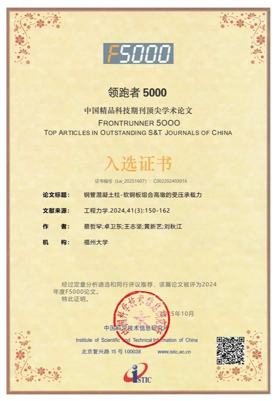 近日,国家科技部中国科学技术信息研究所发布2025年度“领跑者5000——中国精品科技期刊顶尖学术论文(F5000)名单”,我校引进博士蔡哲罕老师发表于中国卓越期刊《工程力学》的论文《钢管混凝土柱-软钢板组合高墩的受压承载力》成功入选。