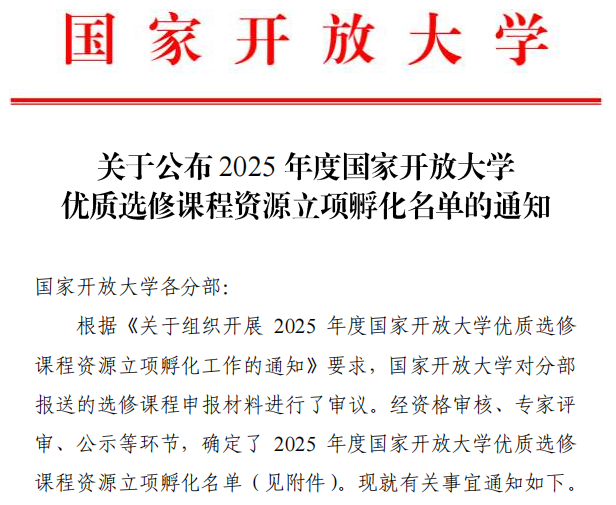 为进一步提升国家开放大学办学体系学历教育选修课程资源建设质量,打造一批可推广、高品质的选修课程资源,国家开放大学于2025年9月正式启动第二批优质选修课程资源立项申报工作。经资格审核、专家评审、公示等多轮严格筛选,最终来自25个分部的33门课程进入第二批立项孵化名单,我校申报的2门课程凭借鲜明的特色和扎实的建设基础成功入选。此前,我校黄健新教授团队负责的《管理方法与艺术》课程于2024年6月入选国家开放大学第一批选修课程立项孵化名单,现已完成建设,国家开放大学正组织验收。