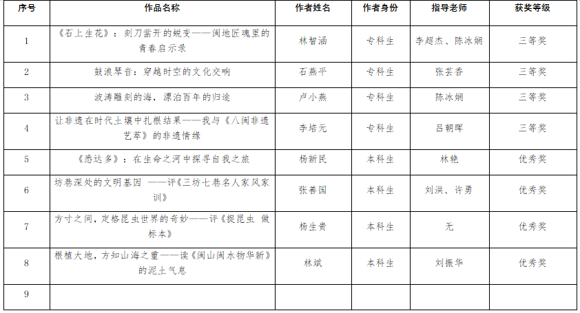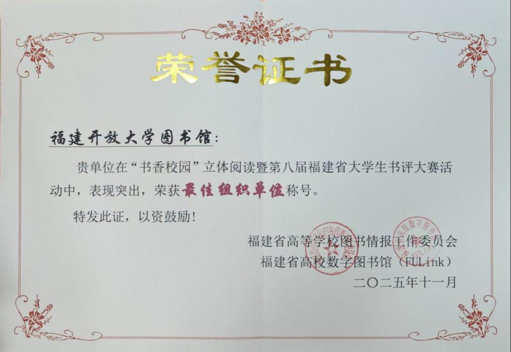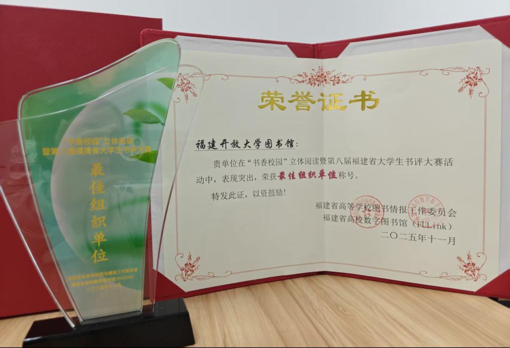 近日,由福建省高等学校图书情报工作委员会、福建省高校数字图书馆(FULink)举办的第八届福建省大学生书评大赛圆满落幕。学校图书馆协同校团委、职业学院等单位积极组织师生参赛,最终共获18项奖项,创学校历年最佳成绩,并荣获“最佳组织单位”称号。