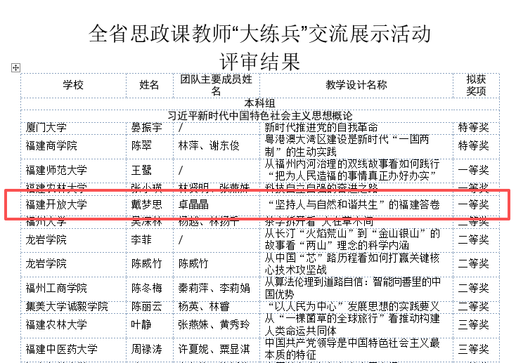 近日,福建省教育厅公布2025年全省思政课教师“大练兵”交流展示活动评审结果,我校马克思主义学院戴梦思老师、职业学院赖海昌老师分别荣获本科组、高中(中职)组一等奖。
