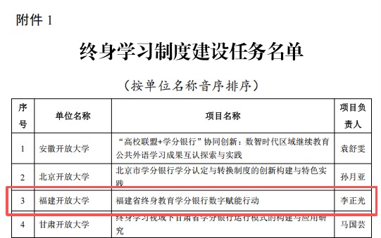 近日,教育部公布第三批高等继续教育领域学习型社会建设重点任务入选名单,福建开放大学申报的“福建省终身教育学分银行数字赋能行动”项目成功入选。该项目由我校牵头,联合福建信息职业技术学院、福建卫生职业技术学院共同建设,是福建省唯一入选的终身学习制度创新类项目。