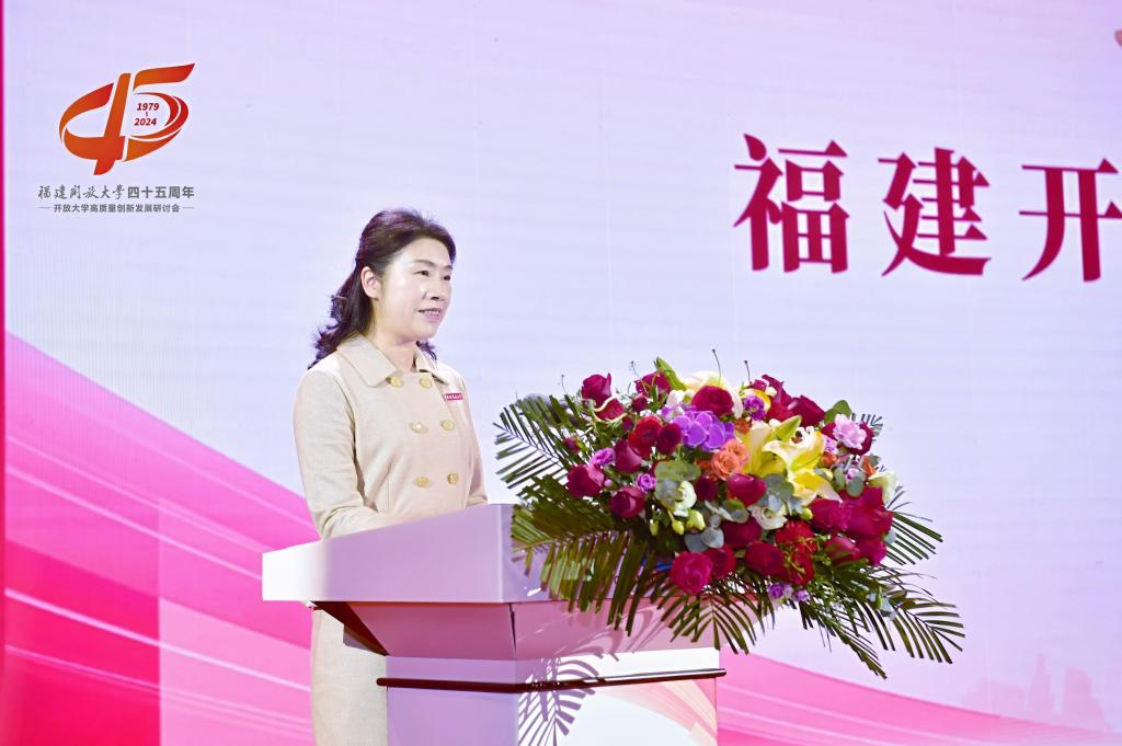 庄莉表示,学校办学45年来,扎根八闽大地、面向“一切学习者”辛勤耕耘,收获了弥足珍贵的思想和实践财富。学校励精图治、砥砺前行,办学网络遍布全省城乡,走出了一条不平凡的传承之路、发展之路。学校扎根基层、服务一线,积极构建学历教育、非学历教育、终身学习支持服务融合发展的办学格局,累计培养了50多万名应用型技能型人才。学校与时俱进、开拓创新,深入推进数字技术与教育教学的深度融合,为促进我省教育公平作出了重要贡献。庄莉表示,新的历史起点上,福建开放大学将锚定育人方向,擦亮“开大底色”,坚持不懈用习近平新时代中国特色社会主义思想铸魂育人;拓展服务面向,提升“开大成色”,以国家老年大学福建分部正式揭牌为契机,积极探索“康养学游”深度融合,促进银发经济高质量发展;强化创新导向,彰显“开大特色”,加强全省办学体系一体化协同发展,推动实现人人皆学、处处能学、时时可学,为谱写中国式现代化福建篇章作出新的更大贡献。